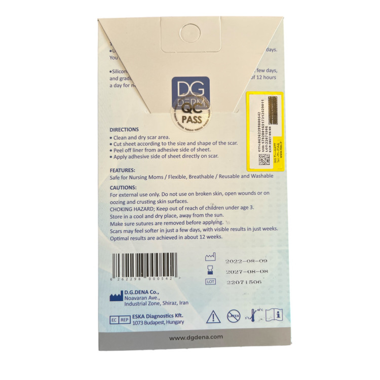 نوار سیلیکونی دی جی درم یک برند ایرانی تولید شده تحت لیسانس شرکت اسکافارما آلمان بوده که علاوه بر اثربخشی بالا، بسیار مقرونبهصرفه است. این نوار سیلیکونی در 9 سایز مختلف جهت استفاده برای انواع اسکار طراحی و تولید شدهاست.