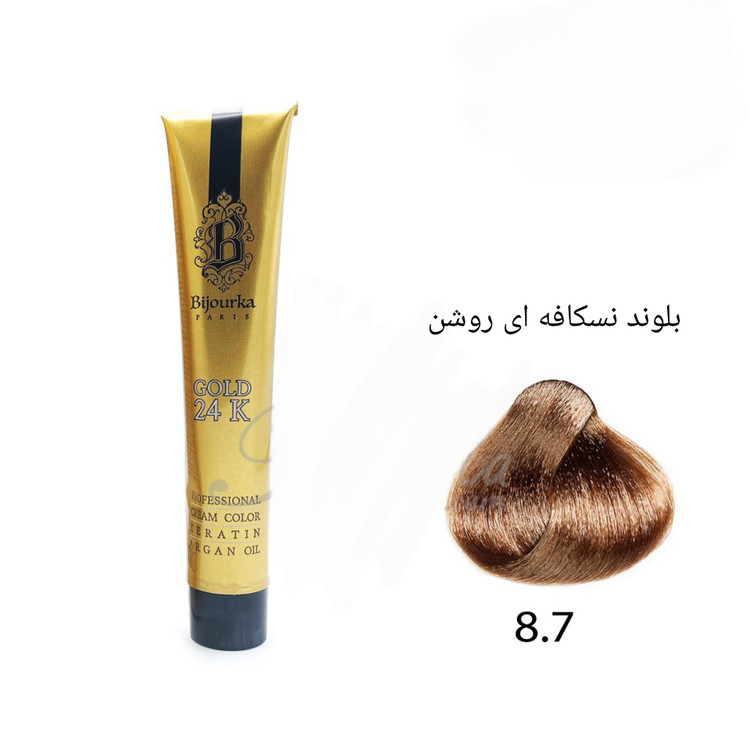 رنگ موی بیجورکا اولین و تنها رنگ موی حاوی طلای ۲۴ عیار می باشد.علتوه بر ذرات طلا حاوی کراتین،روغن آرگان و ویتامین می باشد.
